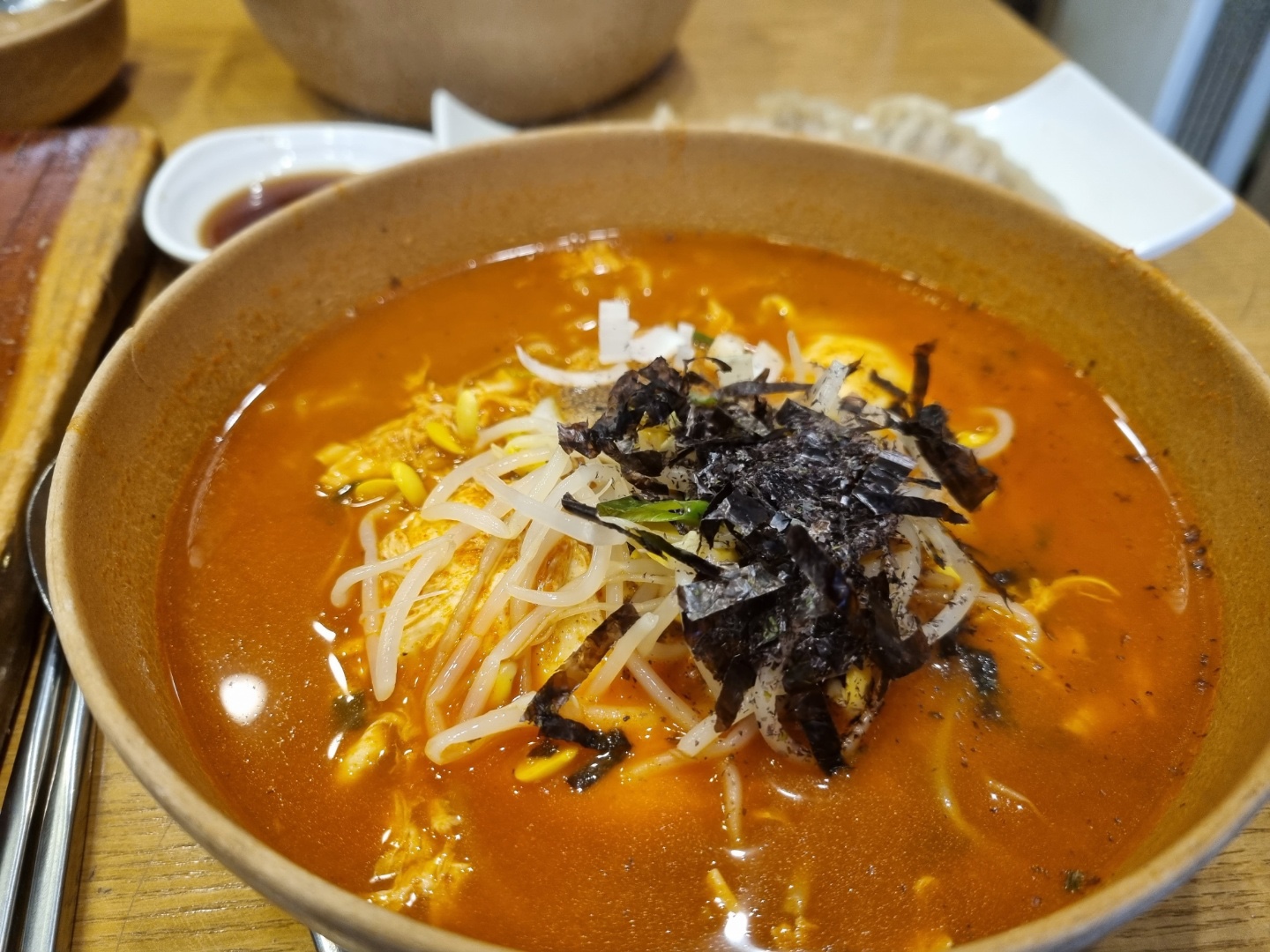 3단계는 국물을 한입 먹자 마자 크읍하게 되는 맛이긴 했는데, 맛있었다! 좀 가볍게 먹기에는 중간 정도가 좋은 듯! 습하습하 하면서 알차게 흡입했다. 국물은 맛있었는데, 자꾸 목을 탁 치는 맛이 있어서 다 먹을 수 없어서 다음에는 중간맛으로 먹어야지 했다. 개인적으로 면보다는 국물파라, 가면 보통 면을 남기고 국물을 다 먹는 스타일인데, 이날은 반대로 라면을 다 먹게 됐다. 다음에 가면 2단계 먹어야지! 매운맛 진짜 좋아하시는 분들은 3단계 도전 해보시는 것도 좋겠다.