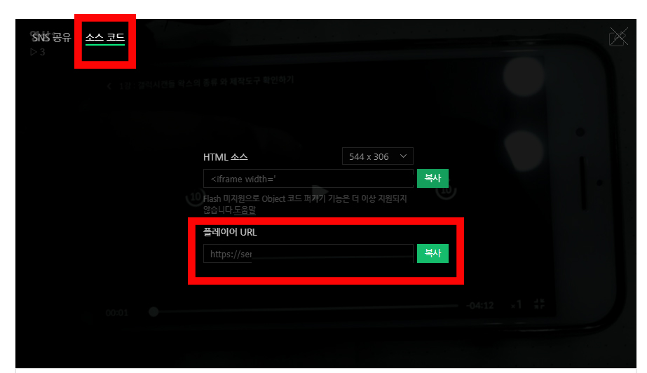 2. 빨간색 박스처럼 소스코드를 눌러서 화면바뀌면 하단의 플레이어 URL을 복사하세요!